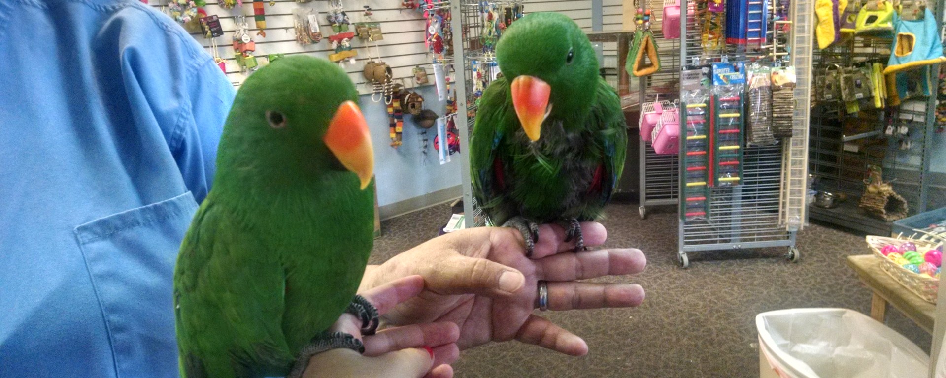 Louie met one of his kin today at the bird shop, a Red-Sided little dude who, at four months old (and still growing!), is the same size as Solomon Island Louie. Actually, junior might be a little bigger.